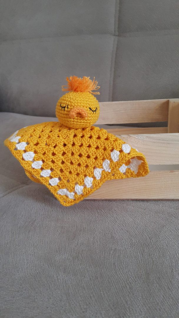5. Son olarak, ördeğin arkasına bir saten kurdele bağlayarak battaniyeyi tamamlayın.